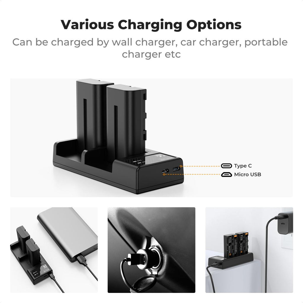 2 x 2200mAh NP-F550 batteries with dual-slot USB charger for Sony devices