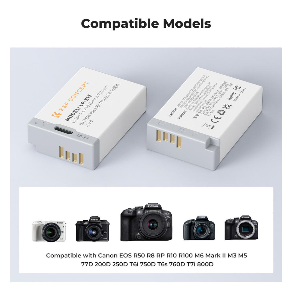 Discover dependable and convenient power with the K&F Concept 2-Pack LP-E17 1040mAh replacement batteries, designed for a wide range of Canon EOS cameras. Featuring built-in USB-C fast charging, these fully decoded batteries deliver safe, efficient and long-lasting performance for photography and video shooting.
